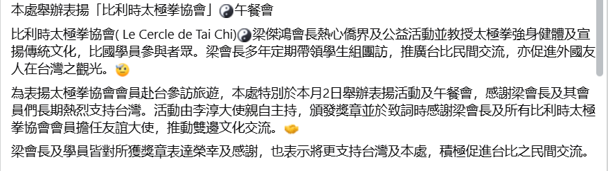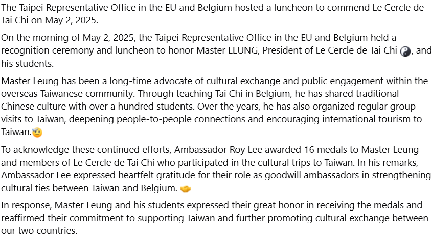 Réception à l’ambassade avec l’ambassadeur pour la remise de la reconnaissance du soutien envers Taïwan